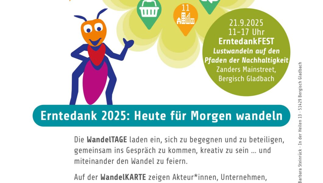 Erntedank mal anders – nachhaltig, lecker und mit Apfelerkennungs-Garantie! Bergisch Gladbach, 04.09.2025 – Am 21. September wird es auf der “MainStreet” vom Zanders-Gelände in Bergisch Gladbach offiziell: Die Nachhaltigkeit feiert Geburtstag – und zwar zum fünften Mal beim Erntedankfest der Nachhaltigkeit. Unter dem Motto „lecker, von hier & zukunftsfähig“ lädt der Ernährungsrat Bergisches Land e. V. von 11 bis 17 Uhr ein – zu einem Tag voller Ideen, Äpfel, Pilzen, Gemüse, Austausch, Musik, Mitmachaktionen für Kinder und sehr…